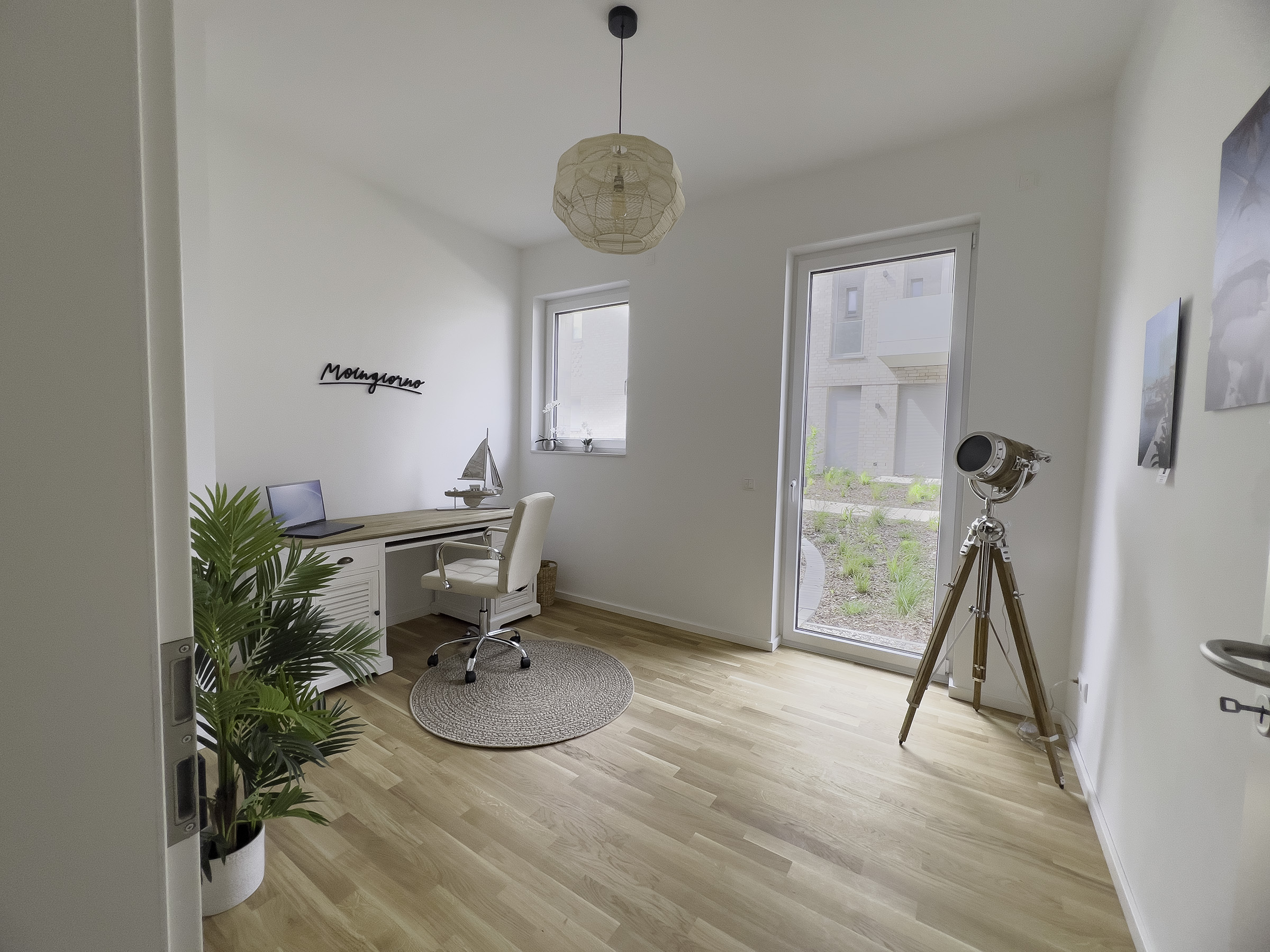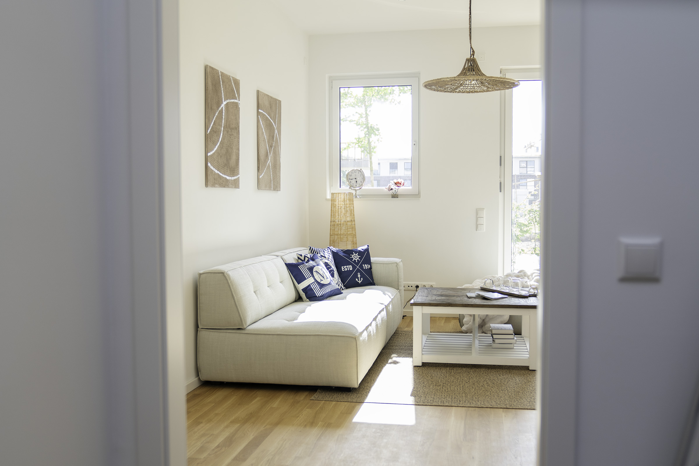 Die Musterwohnung verfügt über 3 Zimmer und befindet sich im Erdgeschoß im Lindaunis-Weg Nr. 9. Anfahrt über Marineallee.