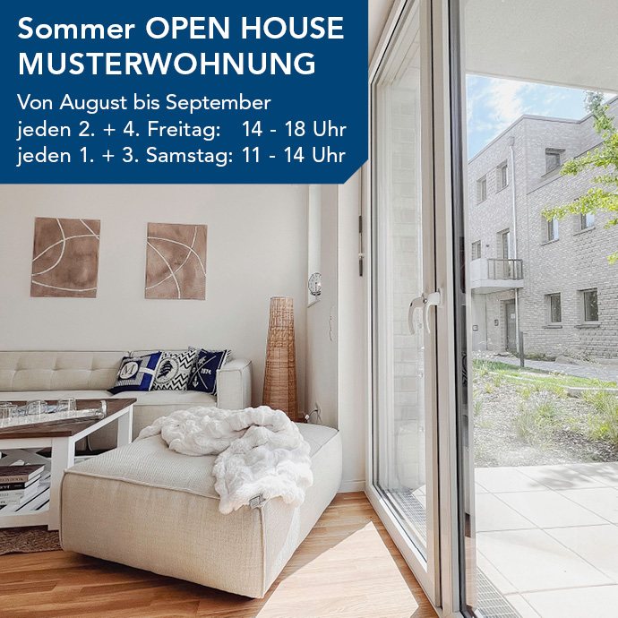 Von August bis September erweitern wir unsere OPEN HOUSE Termine in unserer Musterwohnung. Dann sind wir nicht nur jeden 1. + 3. Samstag von 11 - 14 Uhr, sondern auch jeden 2. + 4. Freitag von 14 - 18 Uhr für Sie da.
